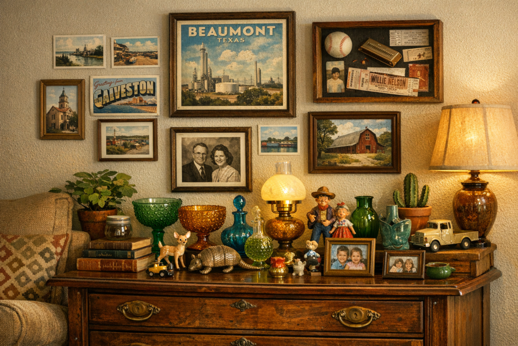 – Hometown pride: sports memorabilia collectibles from your favorite Southeast Texas teams, vintage Kountze or Beaumont postcards in frames